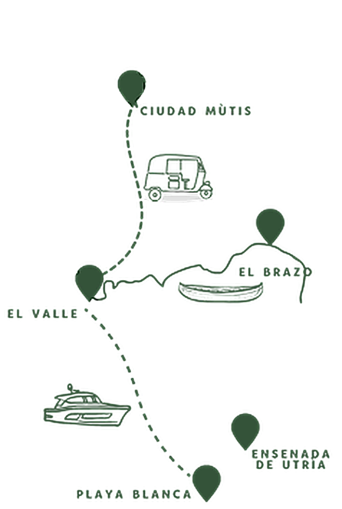 La experiencia cuenta con el acompañamiento de Absalón Caizamo, líder territorial en Isla de Salomón; Angélica Garzón, ornitóloga especializada, en los procesos de observación de aves; y Deisi Hernández, artista ceramista, en los enfoques materiales y sensibles del territorio. Asimismo, se desarrollan expediciones como el sendero submarino apoyado por el biólogo Diego Amorocho y el monitoreo nocturno de tortugas marinas.